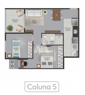 O imóvel possui 40,75m², com 2 quartos, ambientes bem iluminados e ótima ventilação.